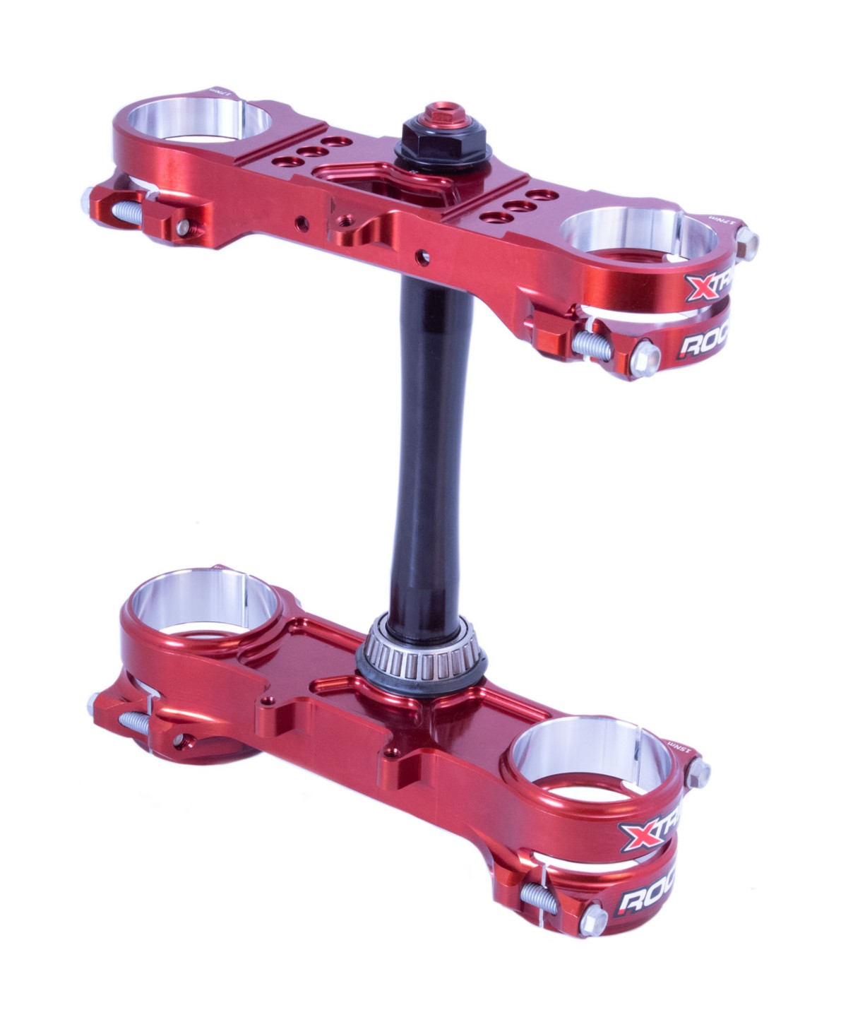 The Revolutionary Opposing Clamp System, ROCS for short, was one of the most spectacular and elaborate developments by XTRIG in recent years. The advantages of this system compared to a conventional triple clamp are the lower deformation of the fork stanchions in the clamping area, which has a noticeable effect on the response of the fork but also the design with the two opposing clamps, which ensures more security against twisting of the fork by the self-locking effect. Another advantage is the fact that the clamping screws do not influence each other, and thus, a more precise tightening torque can be achieved. Since there is no material between the clamping screws, ROCS - triple clamps also have a lower weight in comparison.